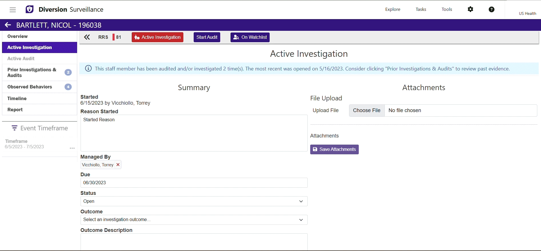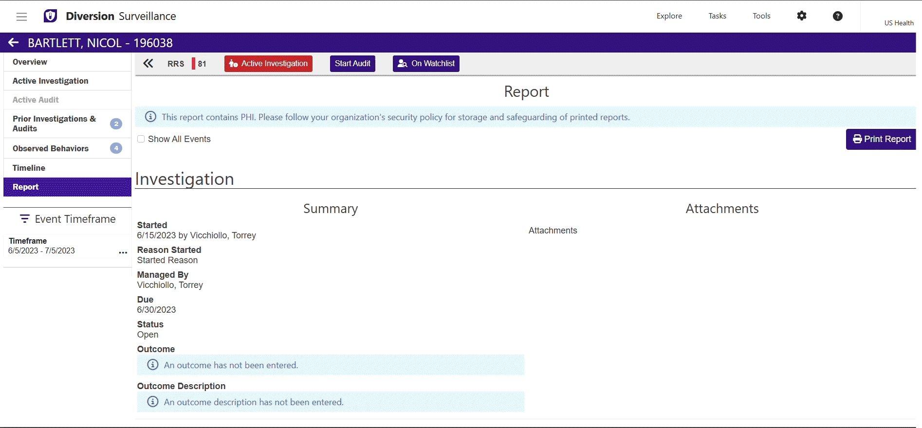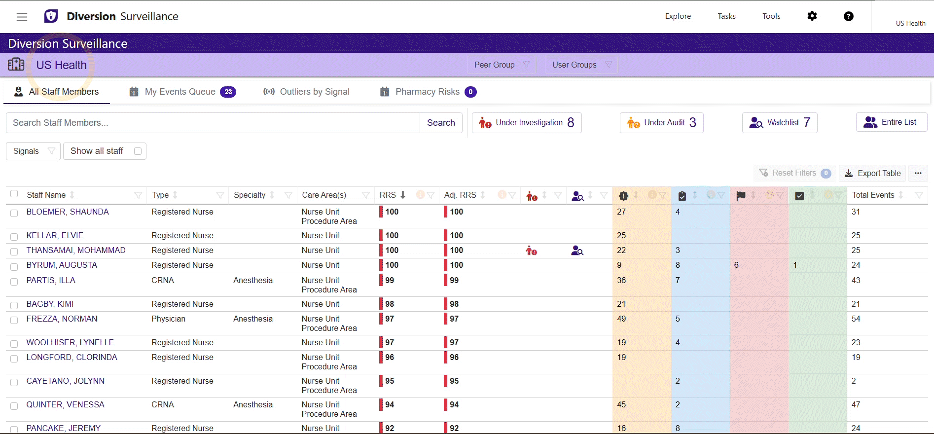 - Enables pharmacy and compliance teams to get a consolidated summary of all staff linked to diversion risk behaviors, regardless of department, site, or login location.